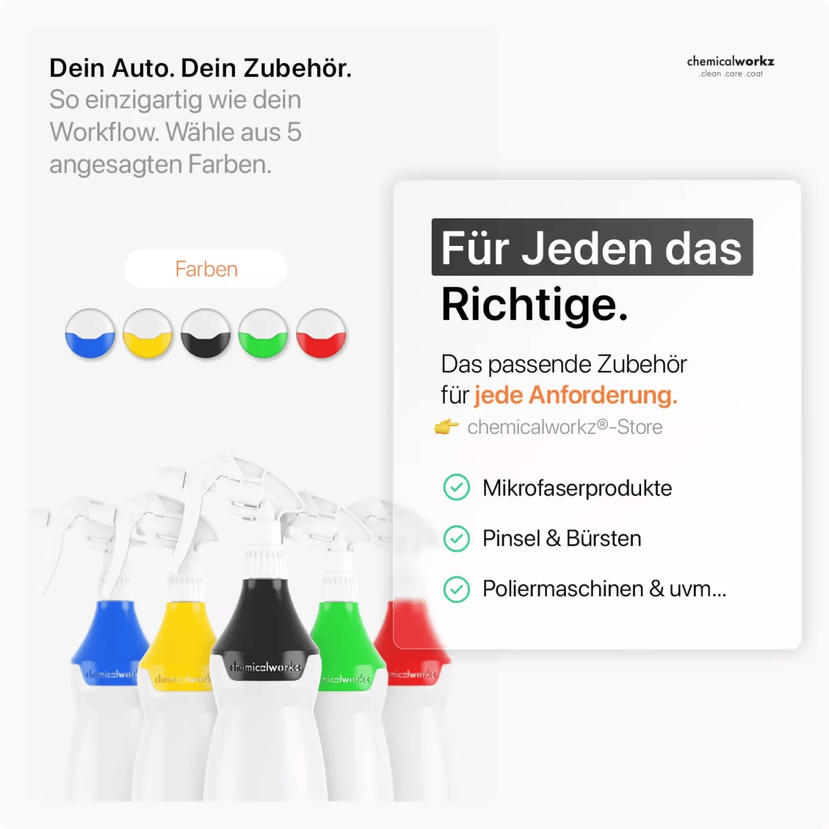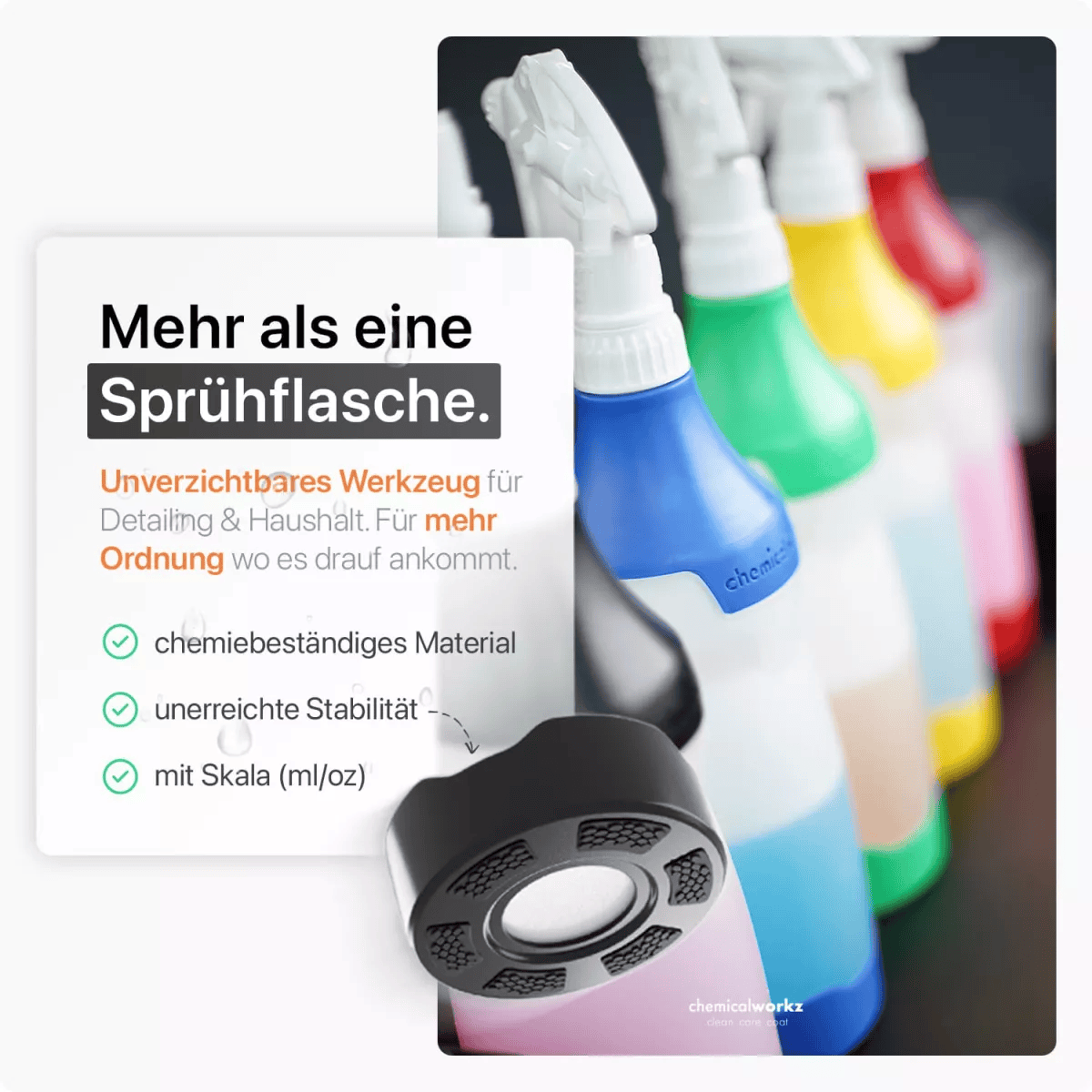 Die chemicalworkz Sprühflasche mit Premium Trigger ist ein professionelles Werkzeug für die präzise und sichere Anwendung von Reinigungs- und Pflegemitteln. Hergestellt aus chemikalienbeständigem HDPE-Kunststoff, bietet sie eine robuste und langlebige Lösung für den Einsatz im Fahrzeugbereich, in der Werkstatt oder im Haushalt.